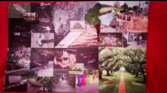 Se ve un ensamble en formato horizontal, este está amplio, debido a eso se alcanzan a ver todos los elementos a la perfección, en este se ven fotografías rectangulares, cuadradas y triangulares. En algunas fotografías se ven paisajes con colores brillantes, unas más llamativas que otras, hay imágenes tanto de paisajes, que por paisaje nos referimos a árboles y áreas verdes, también hay de botes de basura, y hay una de una casa que se encuentra en las manos de una persona y alrededor de esta casa hay árboles y plantas; hay una imagen muy grande de un paisaje (imagen con varios árboles y césped muy verde) con colores muy llamativos que se encuentra en la parte inferior izquierda, por el contrario hay otras muy pequeñas que sobresalen de las otras imágenes debido a que se encuentran en 3D y a la vez son de paisajes muy coloridos o de botes de basura, hay una imagen igualmente de un paisaje que está en forma de triángulo esta cuenta con elementos naturales que son hojas de árboles y un poco de tierra sobre lo que en la imagen parece un árbol llevándolo así también a algo en 3D, las imágenes de los paisajes en su mayoría se encuentran a un lado de una imagen con basura, o bien, sobre imágenes de basura.